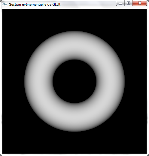 La scène construite est constituée d'un unique tore muni du matériel par défaut d'OpenGL. Le calcul d'illumination est activé et une seule lumière est allumée. L'élimination des parties