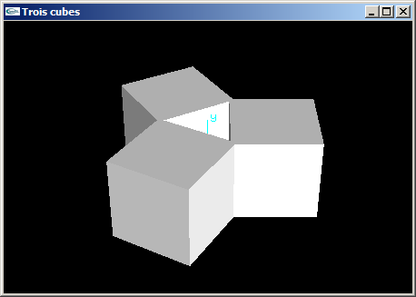 (4) Programmer une scène OpenGL en plaçant 3 cubes de côté 2.0 aux 3 sommets d'un triangle équilatéral défini avec les caractéristiques suivantes :