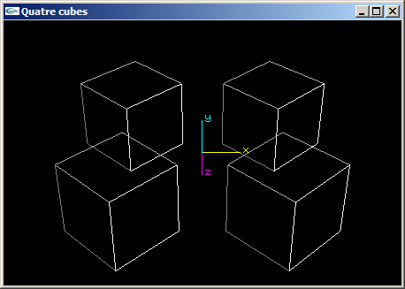 (1) Programmer en OpenGL la scène suivante sous la forme d'une fonction C sans utiliser les fonctions glPushMatrix et glPopMatrix ailleurs qu'en début et fin de fonction : (2) Reprogrammer en OpenGL la scène de la question (1) de telle manière que les cubes aient une de leurs faces orientée vers l'origine du repère. (3) Reprogrammer en OpenGL la scène de la question (2) en utilisant les fonctions glPushMatrix et glPopMatrix pour rendre les objets indépendants les uns des autres et simplifier l'écriture de la fonction scène.