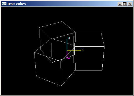(4) Programmer une scène OpenGL en plaçant 3 cubes de côté 2.0 aux 3 sommets d'un triangle équilatéral défini avec les caractéristiques suivantes :