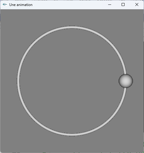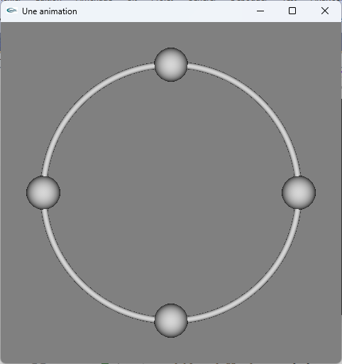 c) Animer la sphère pour qu'elle parcourt le tore à raison de 0.11 degré de rotation entre chaque image. d) Ce n'est plus maintenant une seule sphère placée initialement à 3 heures qui est modélisée dans la scène, mais quatre. Elles sont initialement placées à 3 heures, 12 heures, 9 heures et 6 heures. Réaliser la modélisation géométrique.